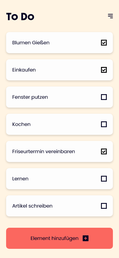Als Beispiel habe ich ein simples Interface gestaltet, welches eine To Do Liste abbildet. Für den Hintergrund habe ich Beige (60%) gewählt. Die Elemente, die die Aufgaben enthalten sind weiß (30%) und der Knopf, mit dem neue Aufgaben hinzugefügt werden können ist Rot (10%). Man sieht also, dass die 60-30-10 Regel in etwa eingehalten wurde.