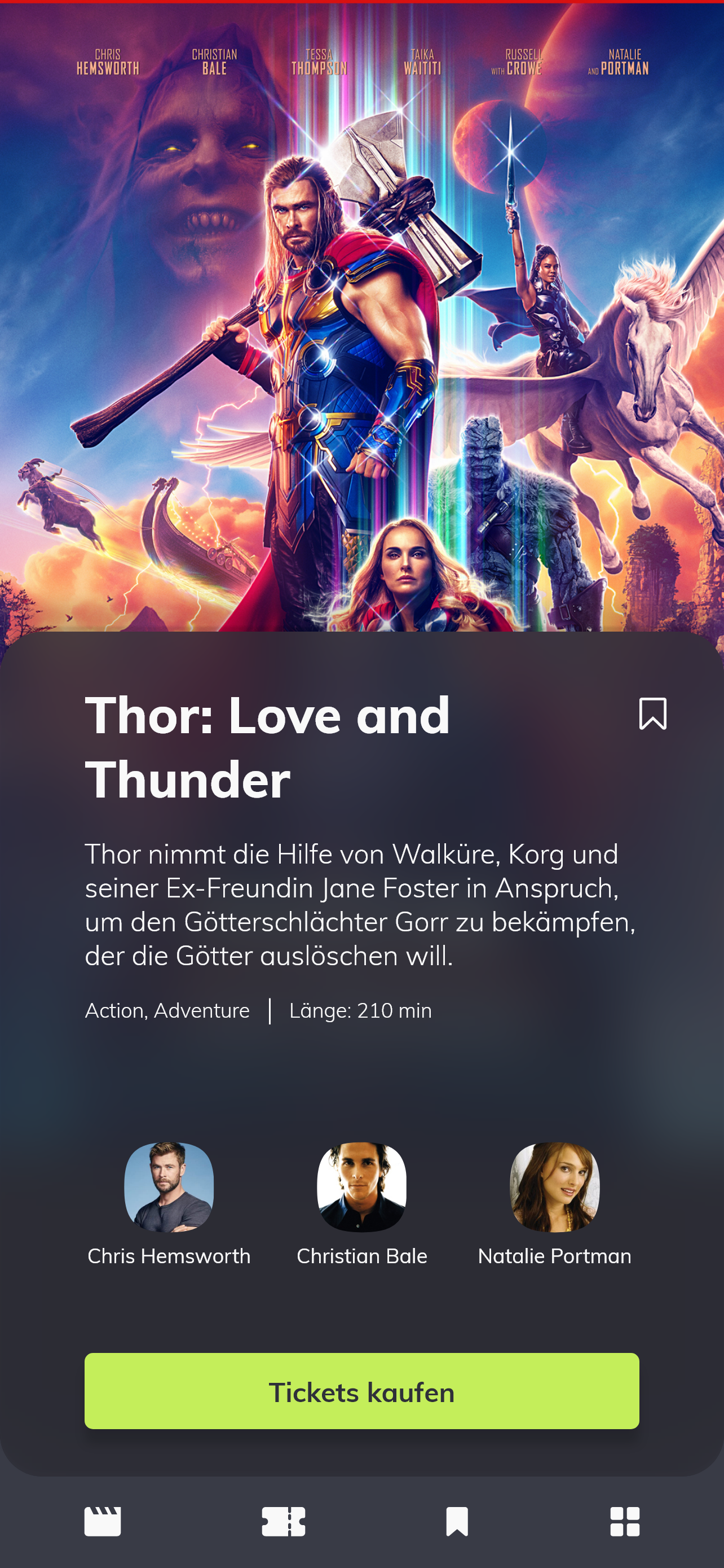 Berühren die Nutzenden ein Filmplakat, öffnet sich die Einzelansicht des jeweiligen Films. Hier gibt es jede Menge Infos über das Genere, die Spiellänge, die Geschichte und die Schauspieler. Der Film kann auch zu den Favoriten hinzugefügt werden, um ihn später leichter wiederzufinden. Zudem können auch direkt Tickets gekauft werden.