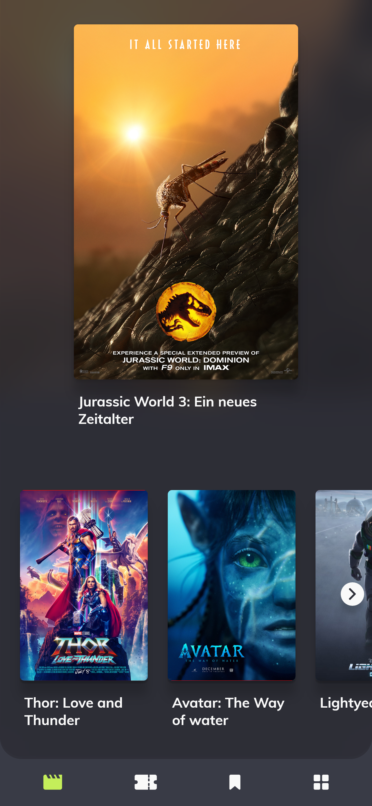 In diesem Bereich werden den Nutzenden alle Filme angezeigt, die zur Zeit im Kino laufen oder demnächst erscheinen. Dabei wird ein Film in ein besonderes Licht gerückt. Dies könnte zum Beispiel ein Film sein, der gerade besonders beliebt ist oder für den eine besondere Werbeaktion läuft.