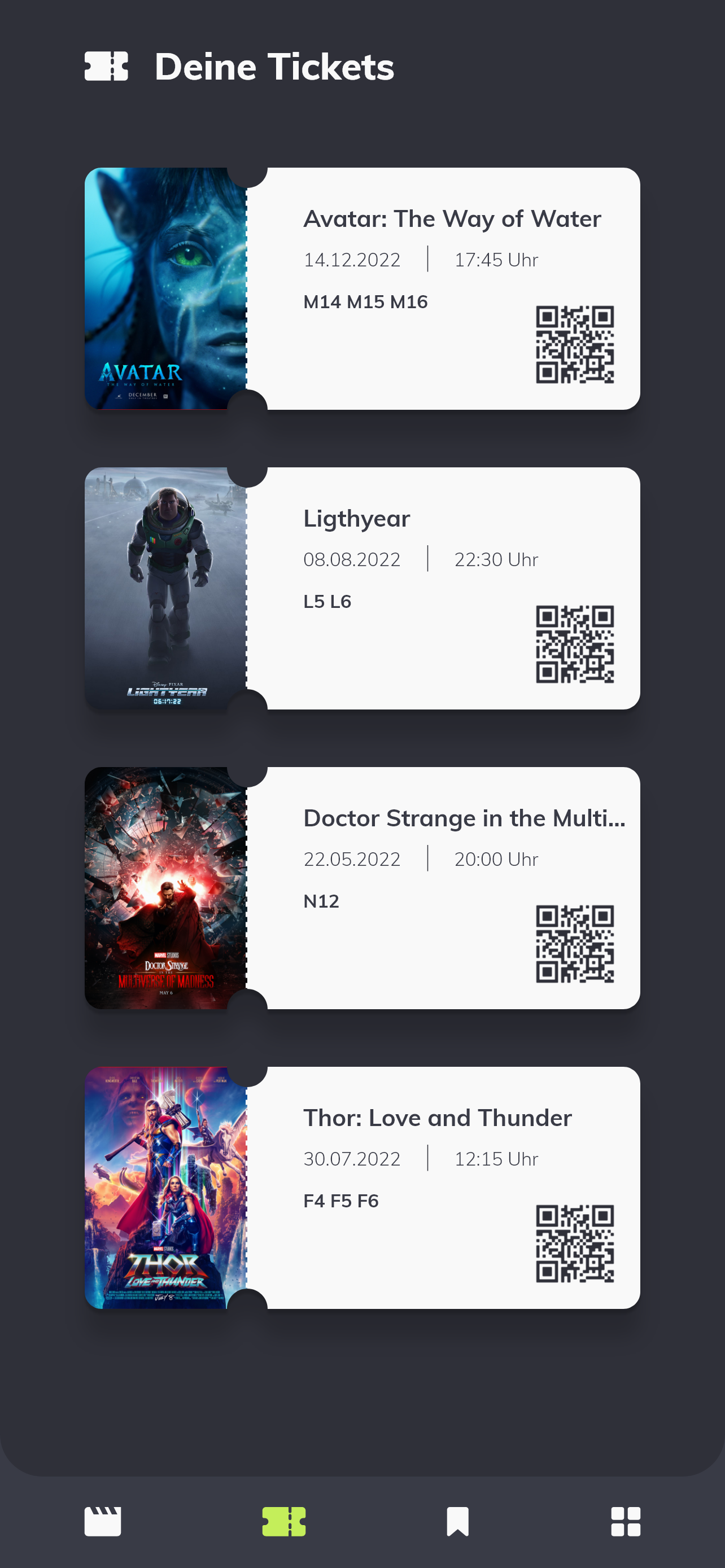 Unter „Meine Tickets“ können nun die gekauften Tickets angesehen und am Einlass vorgezeigt werden. Die Gestaltung lehnt sich dabei an physische Kinotickets an. Darauf zu sehen sind die Spielzeit sowie ein QR Code zum Scannen am Einlass.