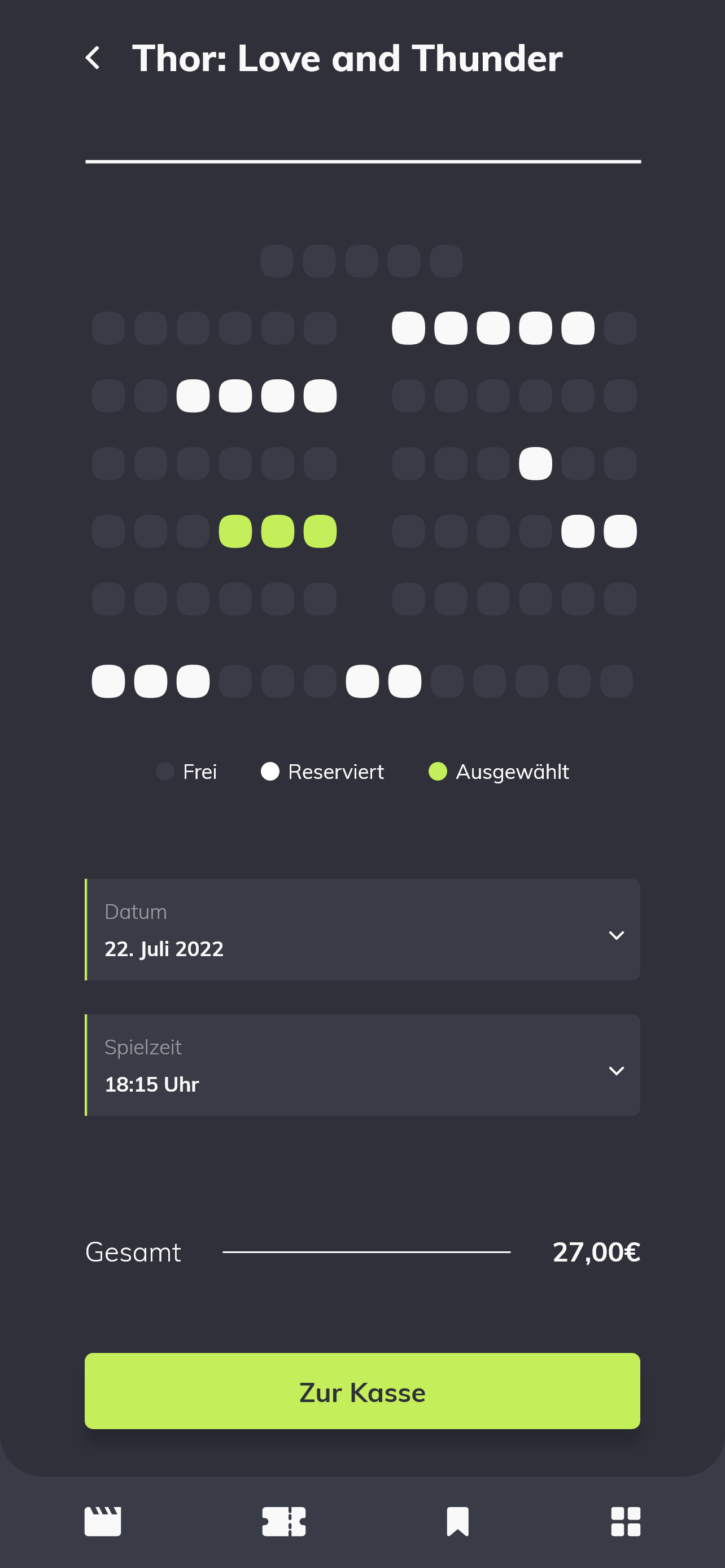Der Ticketkauf läuft wie folgt ab: Die Nutzenden suchen sich eine Spielzeit sowie einen Sitzplatz aus. Die reservierten / freien Plätze sind farblich auf der Ansicht des Kinosaals dargestellt. Anschließend wird der Gesamtpreis berechnet und angezeigt. Per Knopfdruck gelangt man zum Bezahlvorgang.